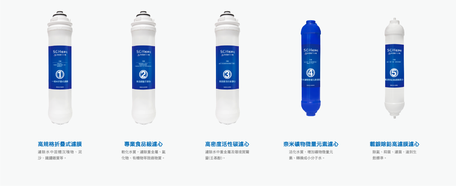 SCH超淨化水素負氫離子水機共有5道濾芯及2道永久免更換生成器,強大的過濾裝置能濾除鐵鏽雜質、石灰質、重金屬、鋁、環境賀爾蒙、氯…等。而其中載銀除鉛超濾膜濾心過濾孔徑為0.02微米(最小細菌為0.05微米),能有效濾菌、抑菌,提供安全超淨化的水質。 注意:任何濾心都有使用效期,請務必定期更換濾心以確保生飲品質!