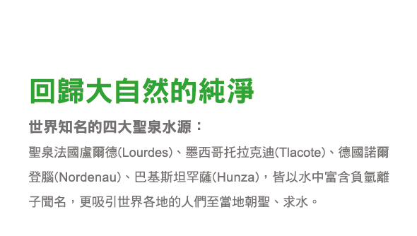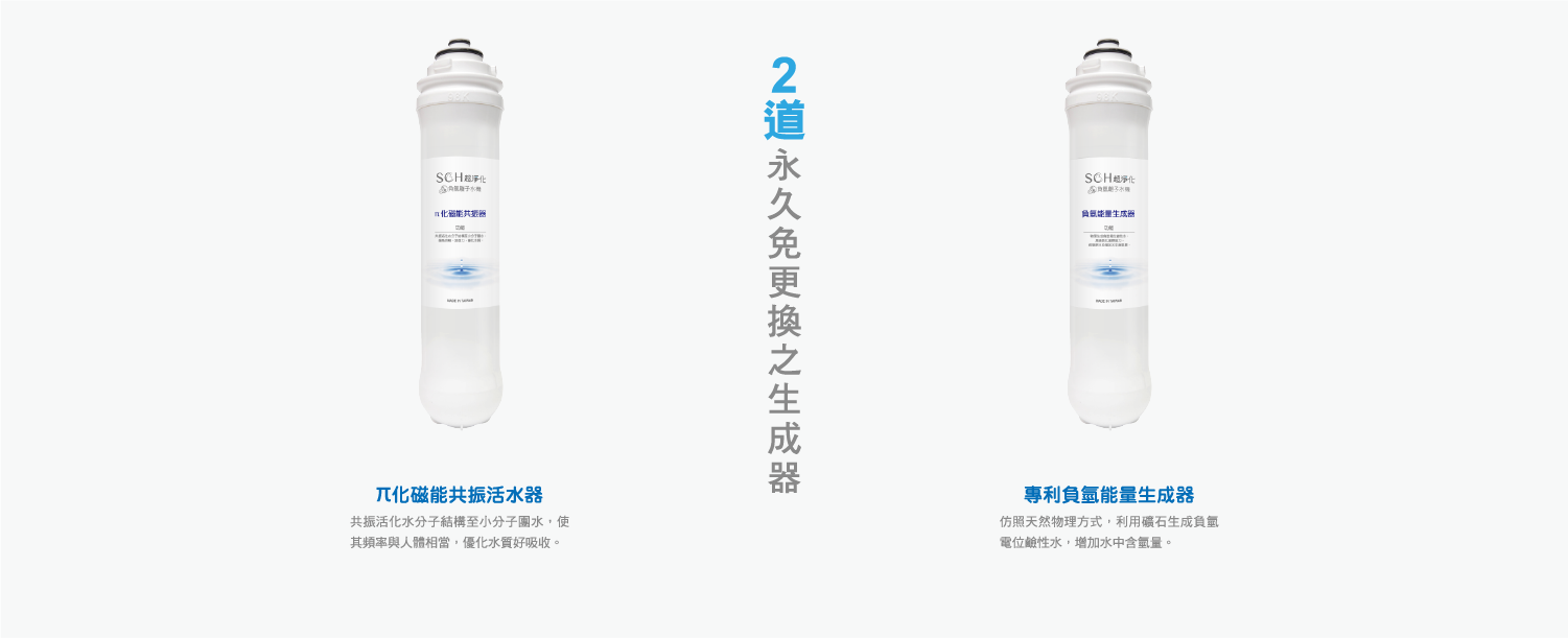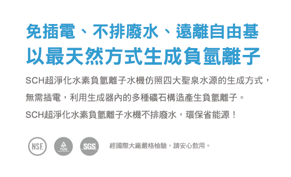 SCH超淨化濾芯仿照四大聖泉岩層結構,利用現代科學奈米技術,打造出π化磁能共振器及負氫能量生成器,使水分子經過共振活化後,與人體體液頻率相當,易於吸收及代謝,且帶有物理生成的負氫離子,幫助調節生理機能。