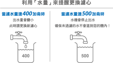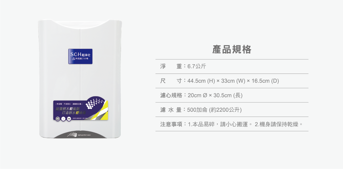 SCH超淨化水素負氫離子水機內建特殊裝置,當濾水量達400加侖時,出水量會變小,此即為更換濾心之提醒。若濾水量滿500加侖,則水機會自動斷水,確保消費者不會喝進未過濾的水。
